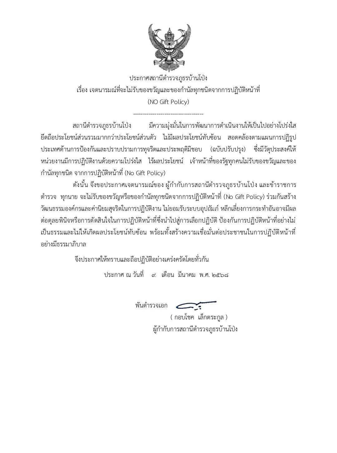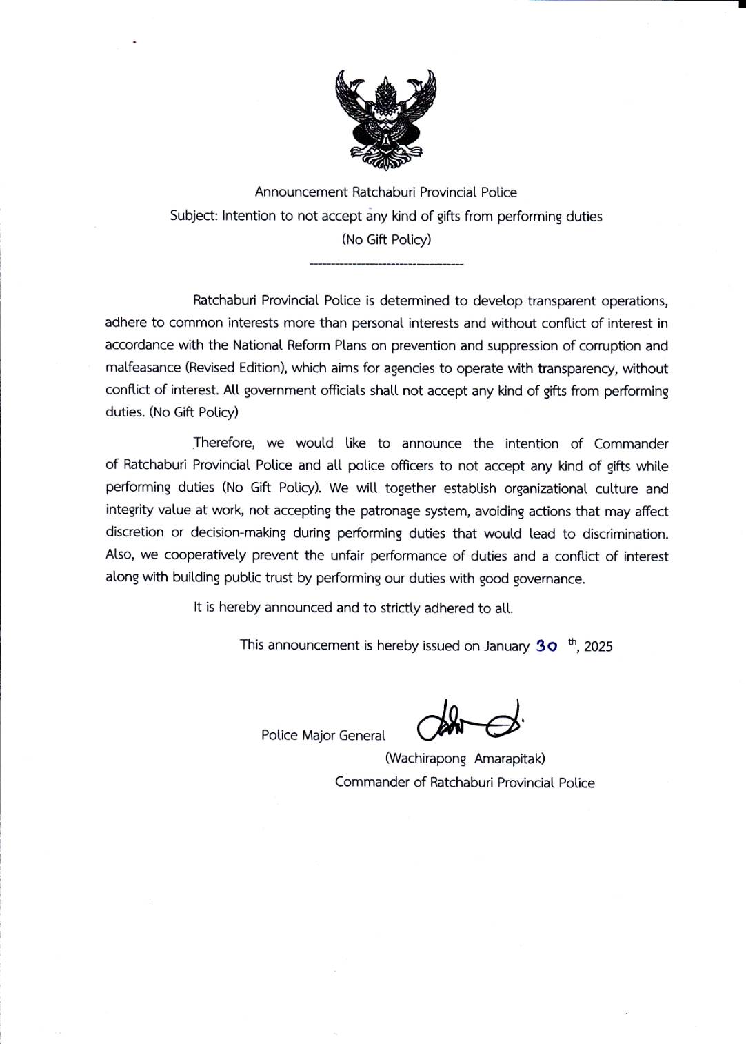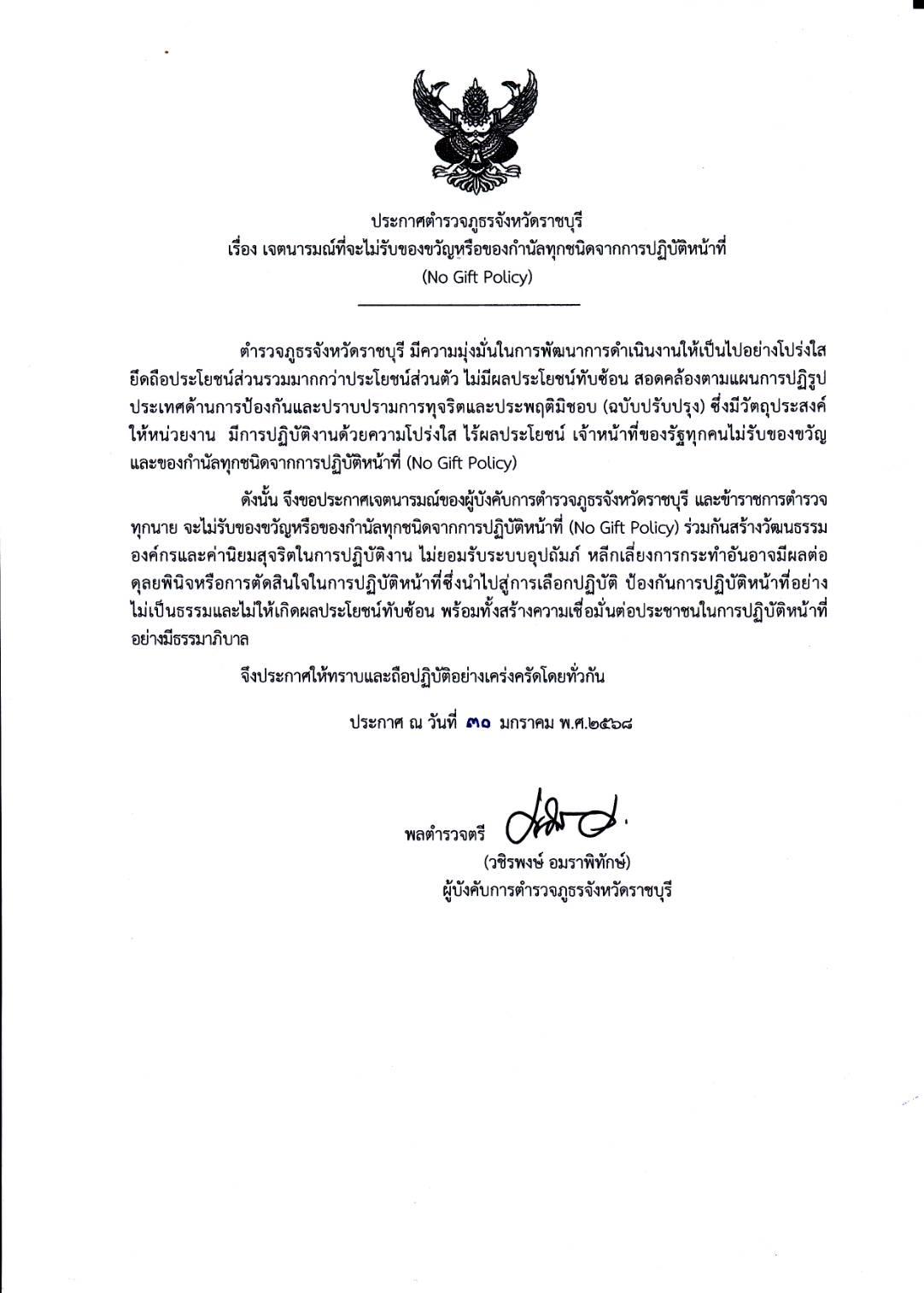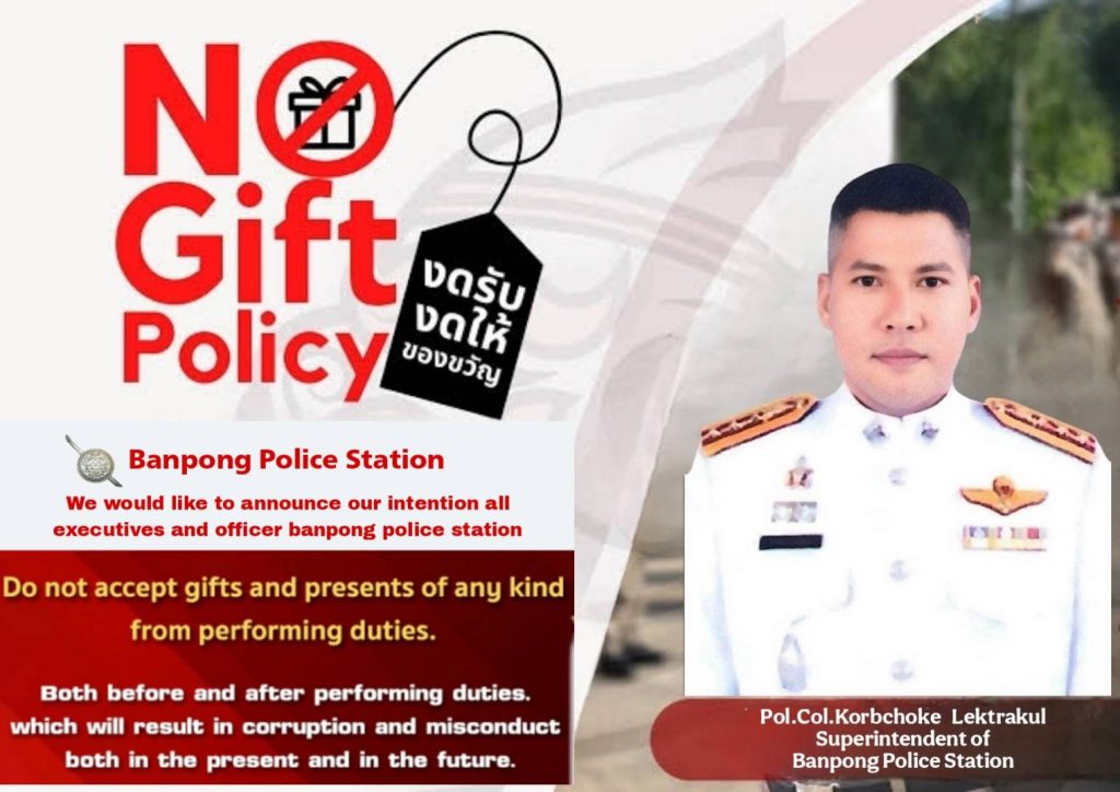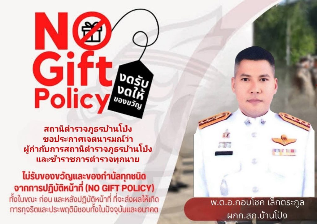 - ประกาศสำนักงานยุทธศาสตร์ตำรวจเรื่องเจตนารมณ์ที่จะไม่รับของขวัญหรือของกำนัลทุกชนิดจากการปฏิบัติหน้าที่