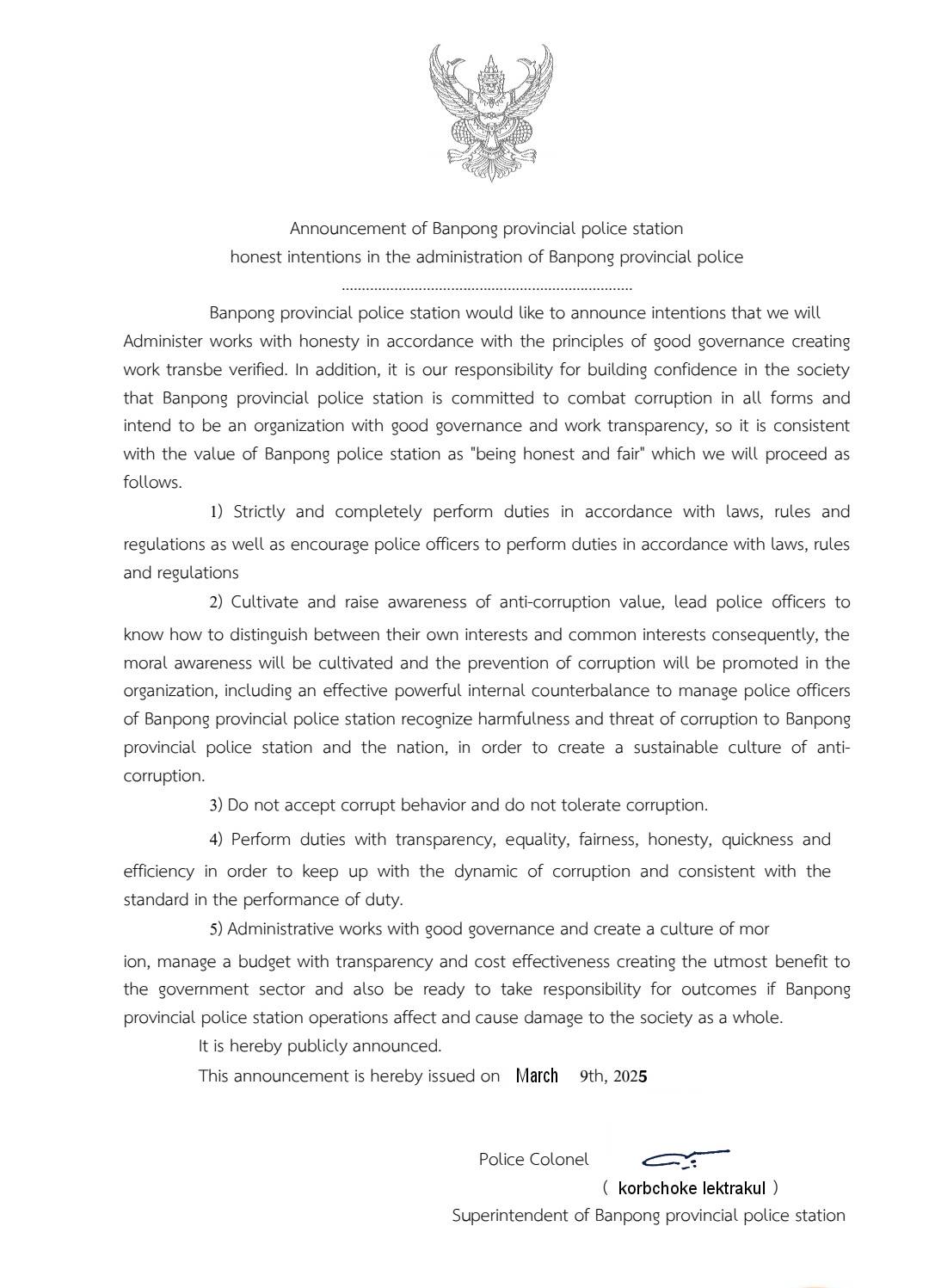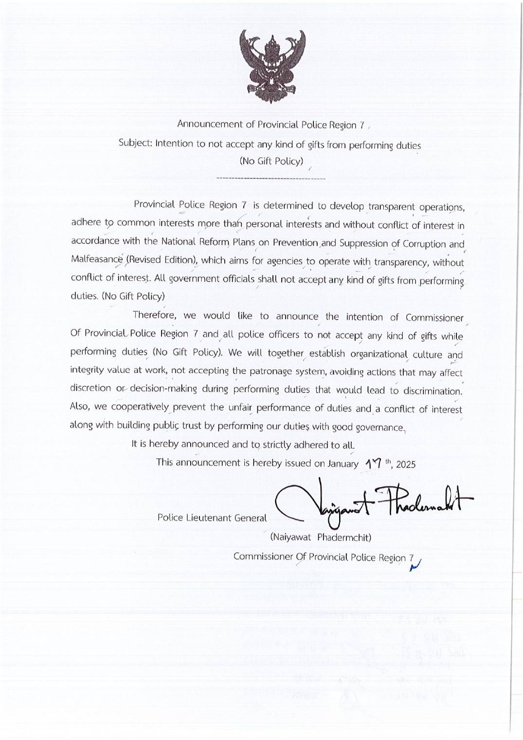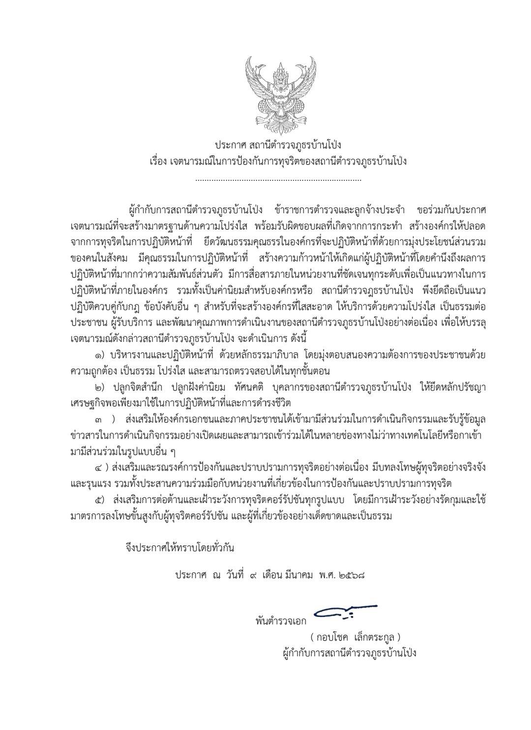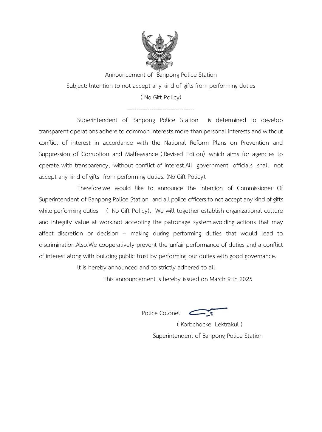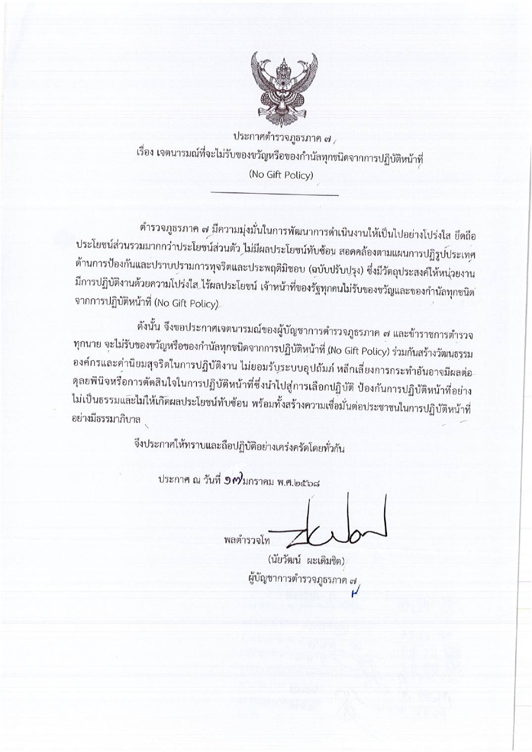 - ประกาศสำนักงานยุทธศาสตร์ตำรวจเรื่องเจตนารมณ์ที่จะไม่รับของขวัญหรือของกำนัลทุกชนิดจากการปฏิบัติหน้าที่